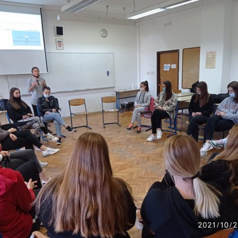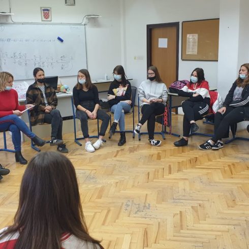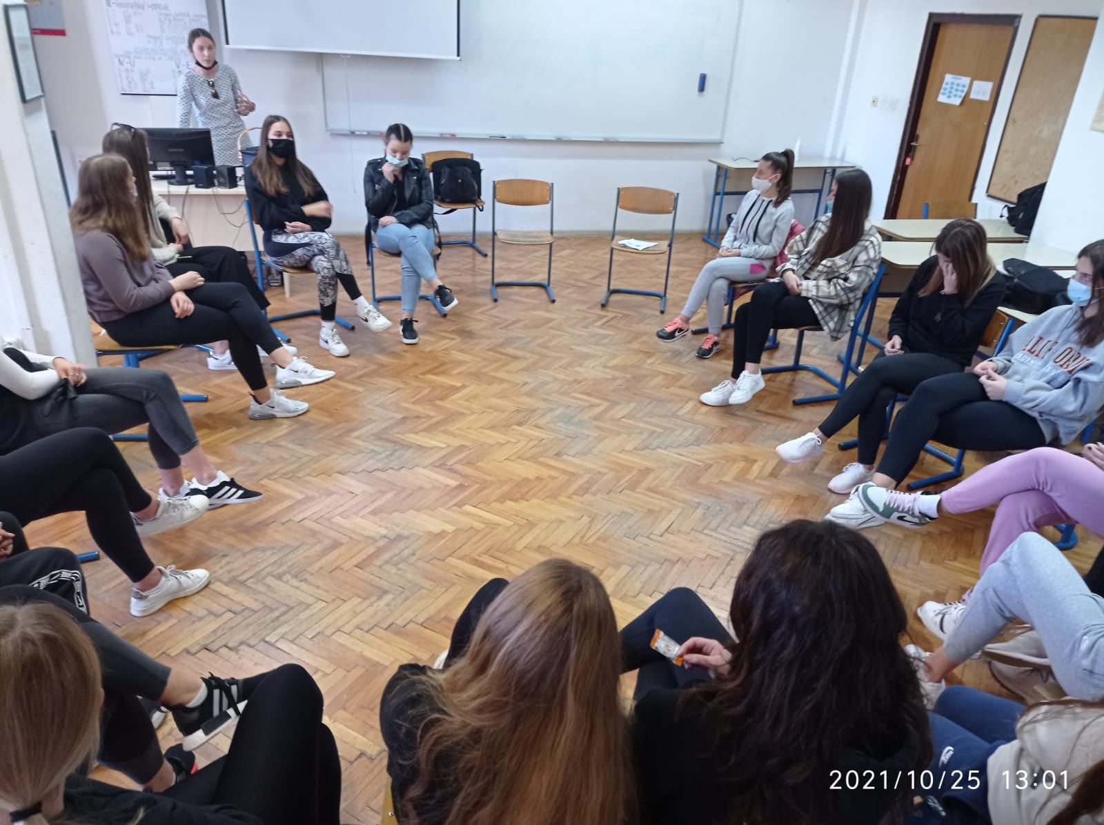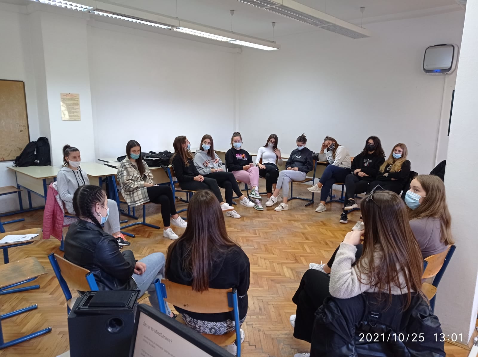 Prof. Linda Bakotić i psihologinja Yvette učenike su upoznale s jednom od najsuvremenijih psihoterapijskih metoda. Mindfulness se jednostavno prevodi kao usredotočena svjesnost, odnosno aspekt svijesti koji nastaje kroz usmjeravanje naše pažnje i pozornosti na određene misli, emocije ili stvari prisutne u sadašnjem trenutku.